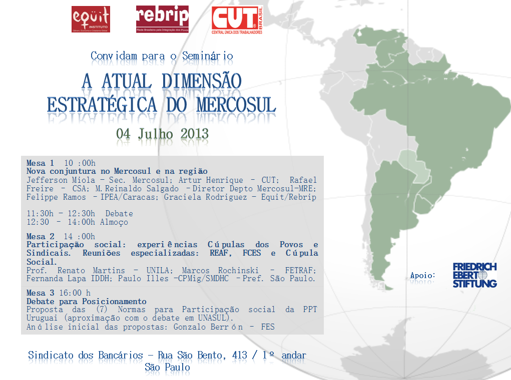 Jefferson Miola – Sec. Mercosul; Artur Henrique – CUT; Rafael Freire – CSA; M.Reinaldo Salgado –Diretor Depto Mercosul-MRE; Felippe Ramos –IPEA/Caracas; Graciela Rodriguez – Equit/Rebrip