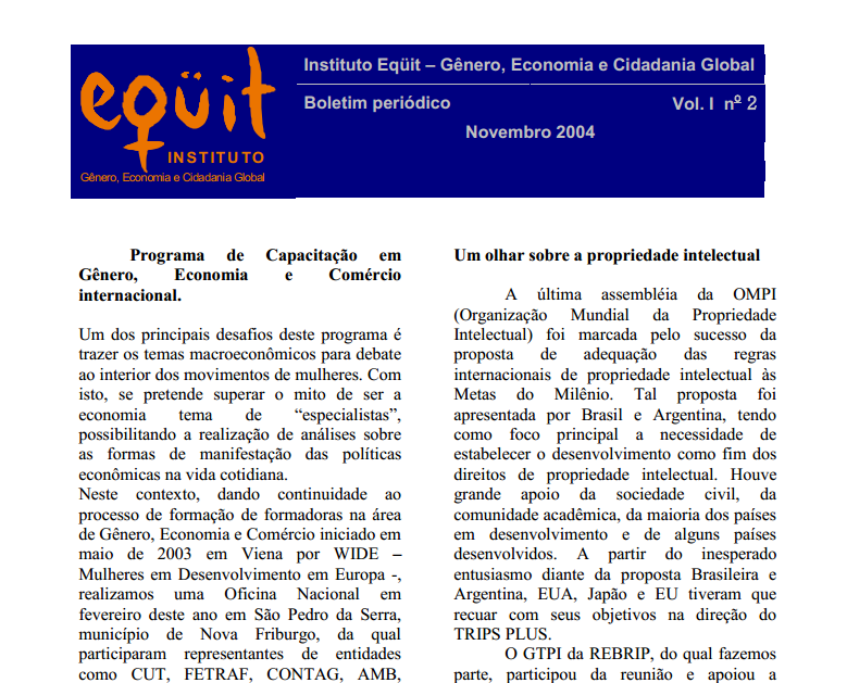 Novembro 2004 (vol. I n.2) Programa de Capacitação em Gênero, Economia e Comércio internacional. Um dos principais desafios deste programa é trazer os temas macroeconômicos para debate ao interior dos Leia mais » 6 de fevereiro de 2013